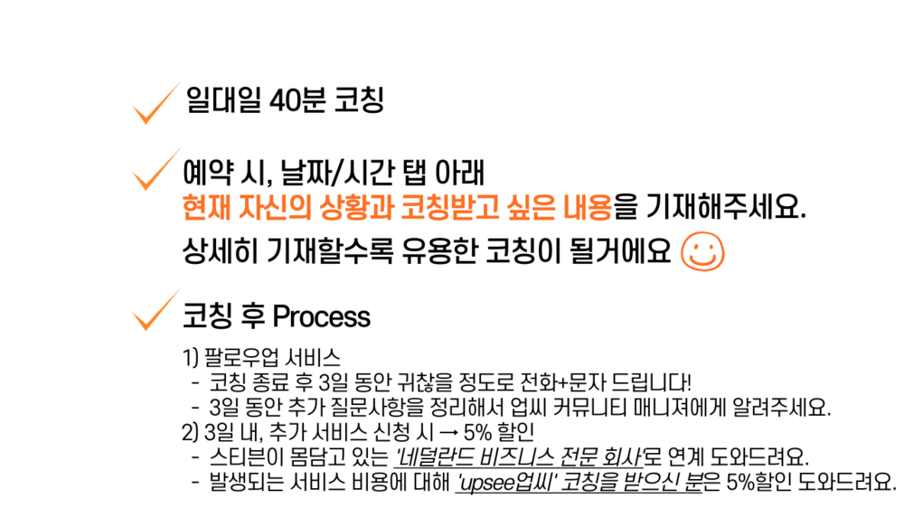 - 코칭이 종료되면 24시간 이내로 커스터마이징(Customizing) 맞춤 과제를 드립니다. 3일 이내로 완료하시고 '업씨' 매니저에게 연락주세요. 업씨 매니저가 과제를 하시는 3일 동안 꾸준히 팔로우업 (문자) 드립니다.
