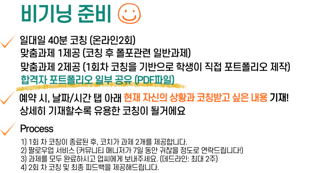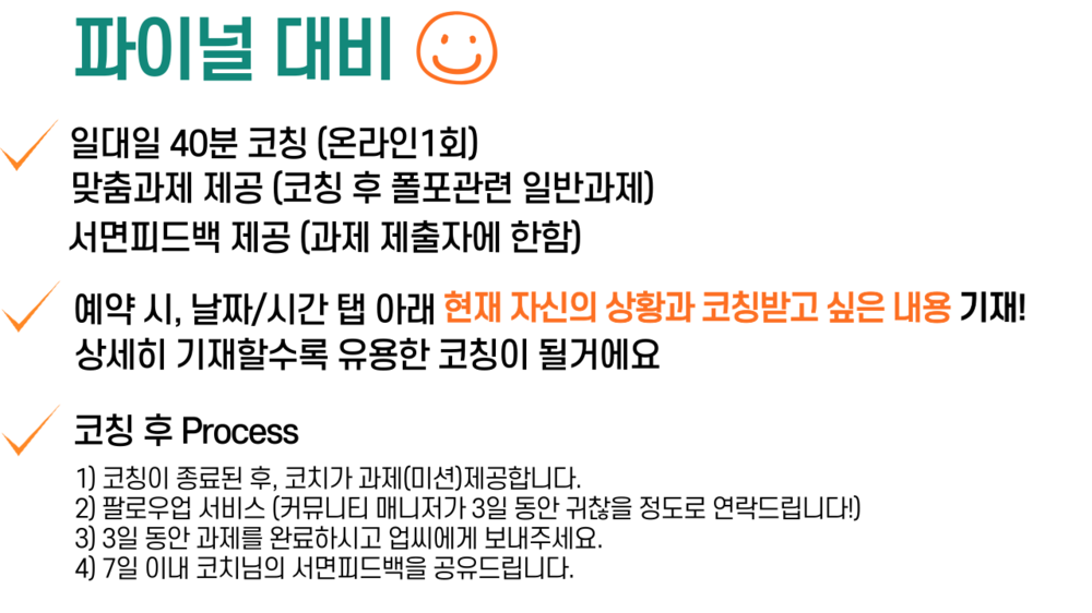 - μ μν΄λμ ν¬νΈν΄λ¦¬μ€λ‘ μ½μΉλκ» νΌλλ°± or μ€κ° μ κ² or κ°μ λ°κ³ μΆμ λΆ